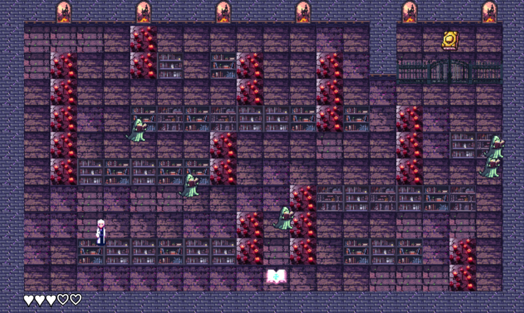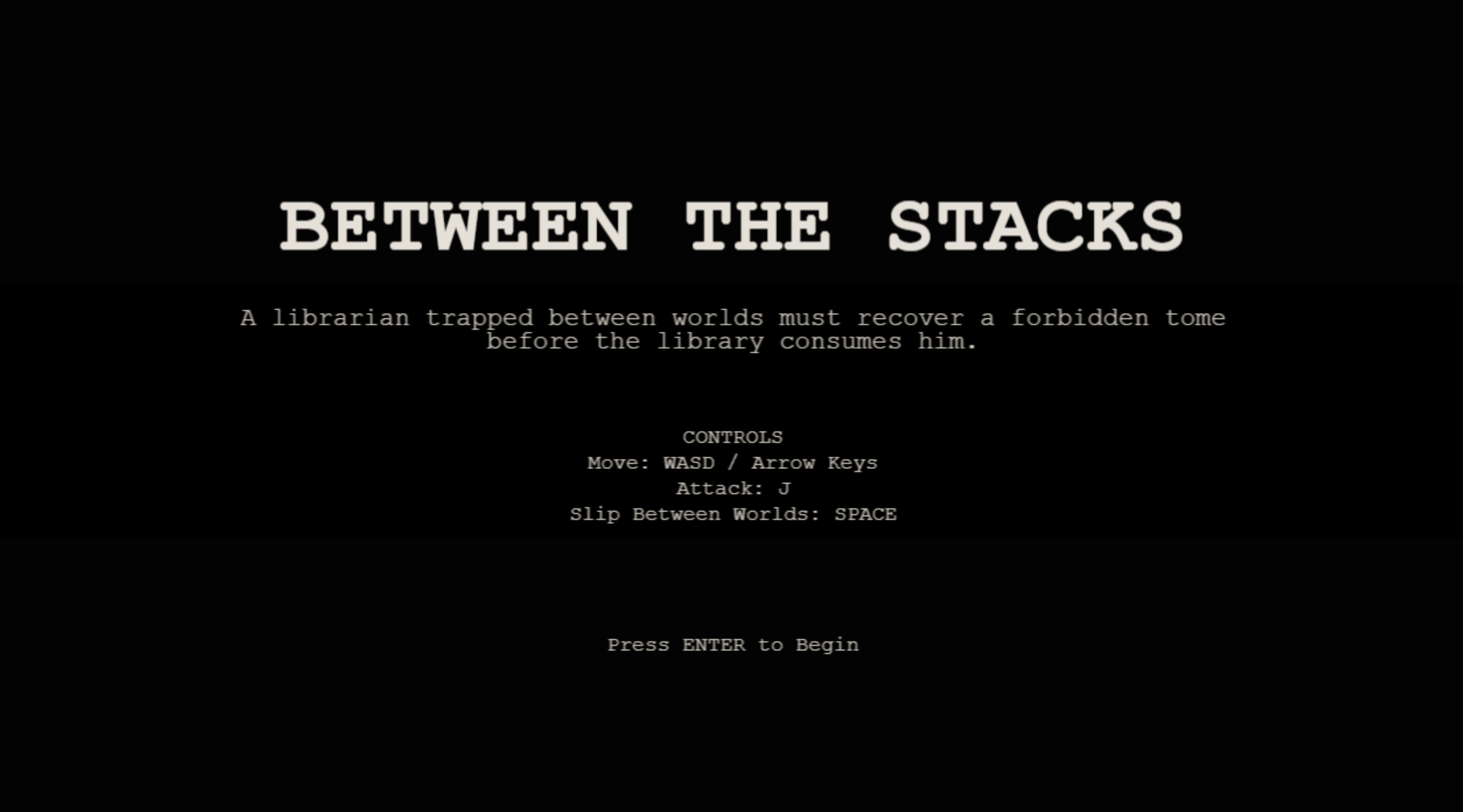 Possessed books hunt you through the stacks. Defeating them weakens a gate, sealing away a forbidden tome. Shifting between worlds is the only way to survive long enough to reach it.